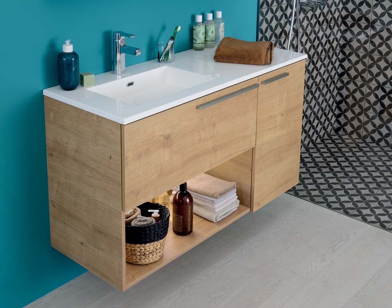 Espaces restreints ou immense salle de bains installation en angle monobloc mur à mur ou carrément destructurée et des plans-vasques pouvant aller jusquà 2m50. Salle de bain nature ou design en bois ou colorée. Sanijura peut répondre à toutes vos envies.