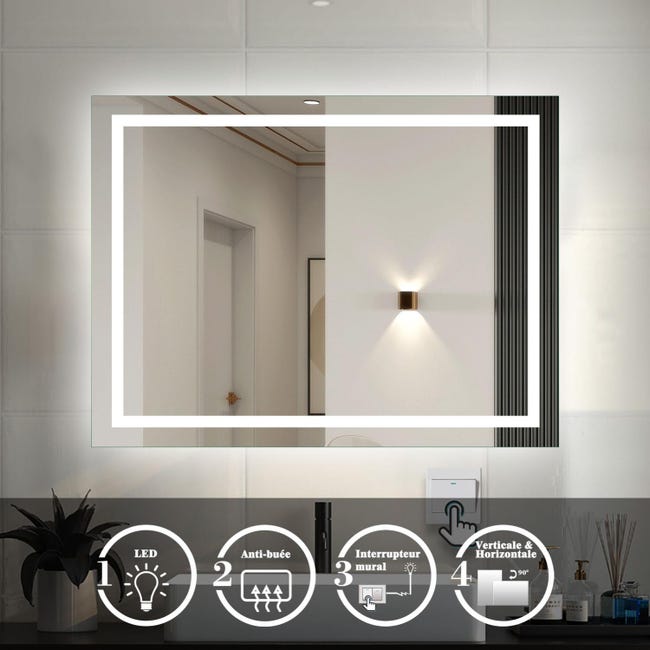 Vous garantir le bon achat on y travaille tous les jours. Miroir simple miroir lumineux ou miroir grossissant nous vous proposons un large choix de produits afin davoir le miroir le plus adapté à votre meuble salle de bains. Produit certifié à la norme de certification IP44 -Méthode de Suspension de Miroir ce miroir de salle de bain peut être installé verticalement et horizontalement.